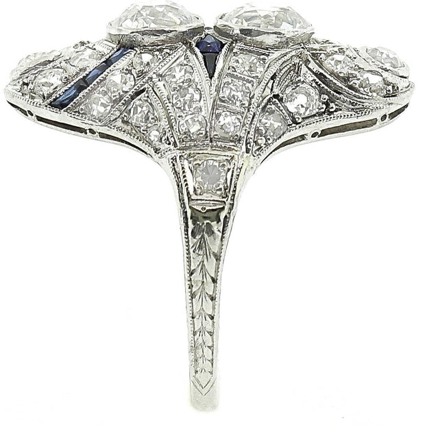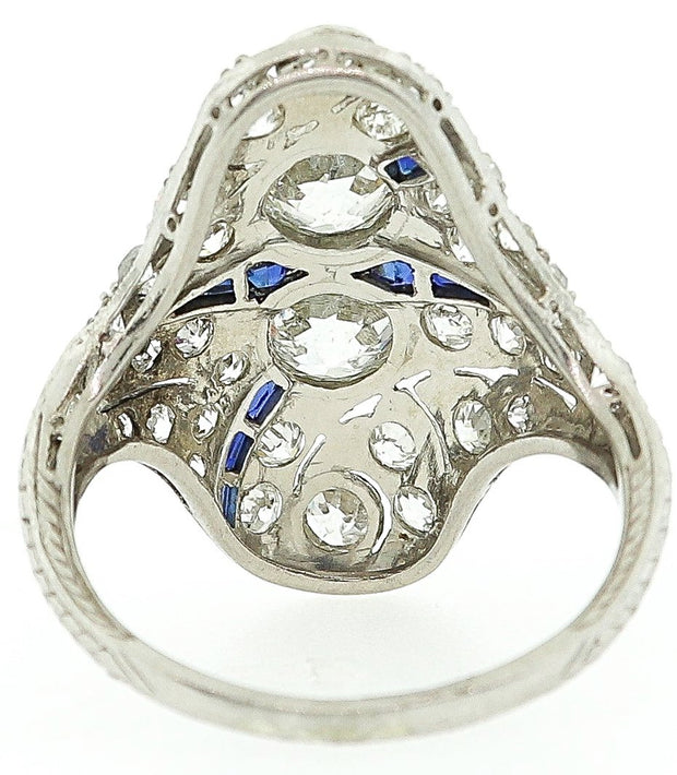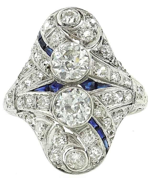 Art Deco Two Stone Old European Cut Diamond & French Cut Sapphire Filigree Dinner Ring in Platinum, circa 1920's. There are two central Old European Cut Diamonds anchored in the middle of the ring. Sprinkled to the sides, to frame the geometric filigree details. There is a total of approximately 1.70 carats total weight of diamond and 10 Sapphires that have a deep blue hue and beautiful saturation. This handmade piece of vintage history features a technique known as a "pierced gallery," which has been meticulously crafted for each and every diamond. This detail creates considerable strength to secure each diamond, while leaving spacing between each to allow light to flow into the underbelly of the ring and maximize the brilliance of the diamonds. Don't expect to see this technique on modern pieces of jewelry, as it is incredibly time intensive and is reserved for very exclusive jewelry.